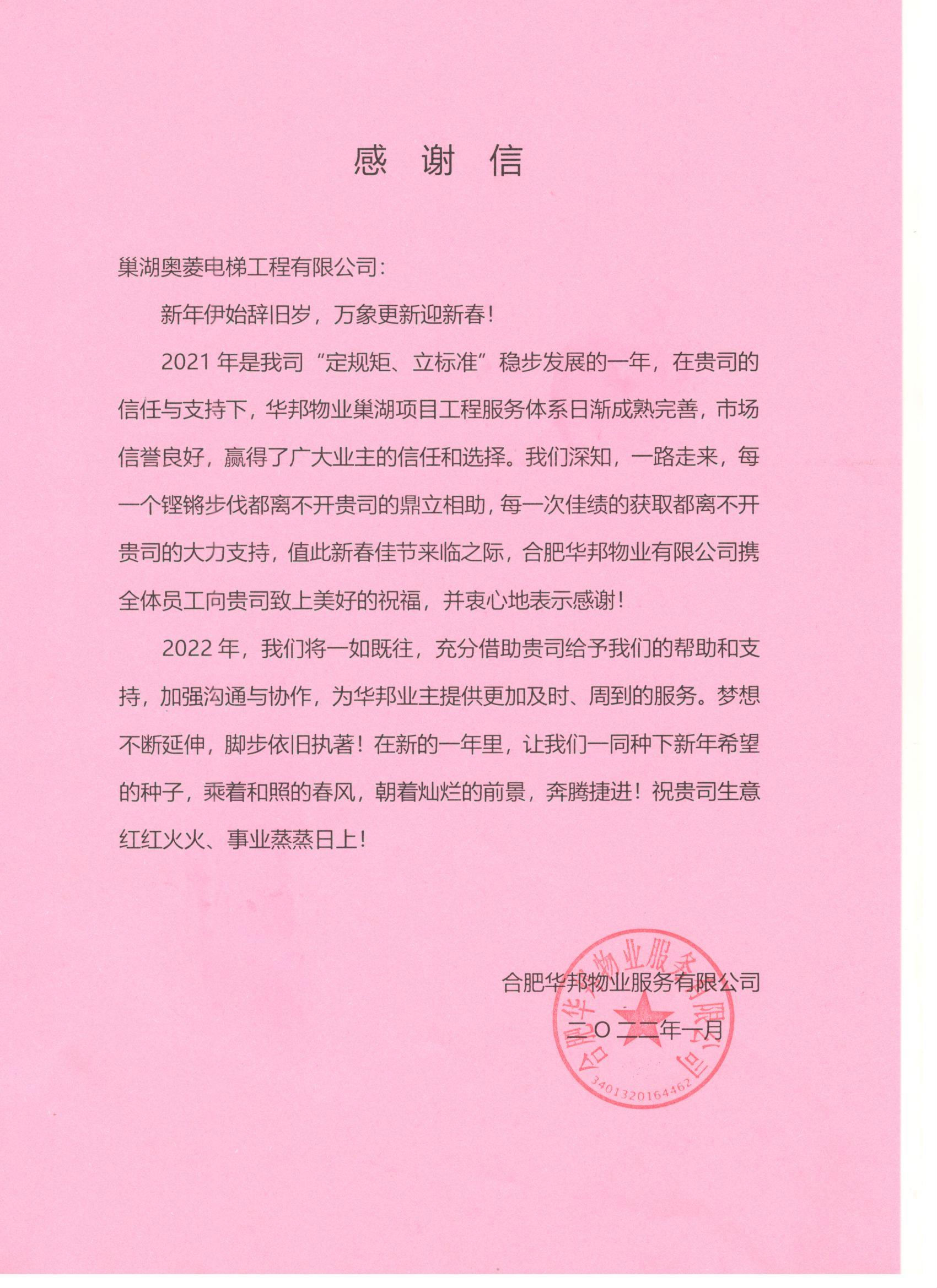 在2021年年度工作中我公司始終把用戶、質(zhì)量、信譽(yù)放在首位,優(yōu)質(zhì)高效的完成了2021年度的維保工作。對(duì)此,合肥華邦物業(yè)服務(wù)有限公司表示非常的滿意,特此寄來(lái)了一封感謝信,以表彰我公司。